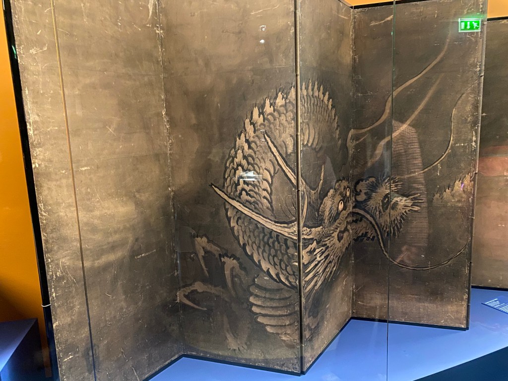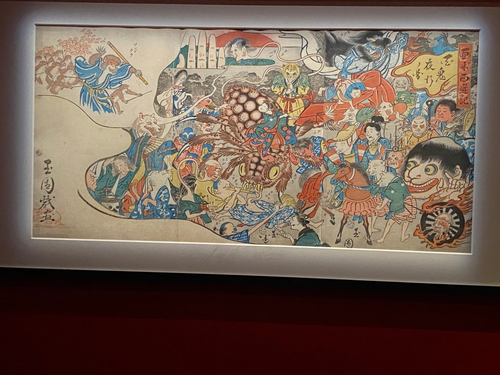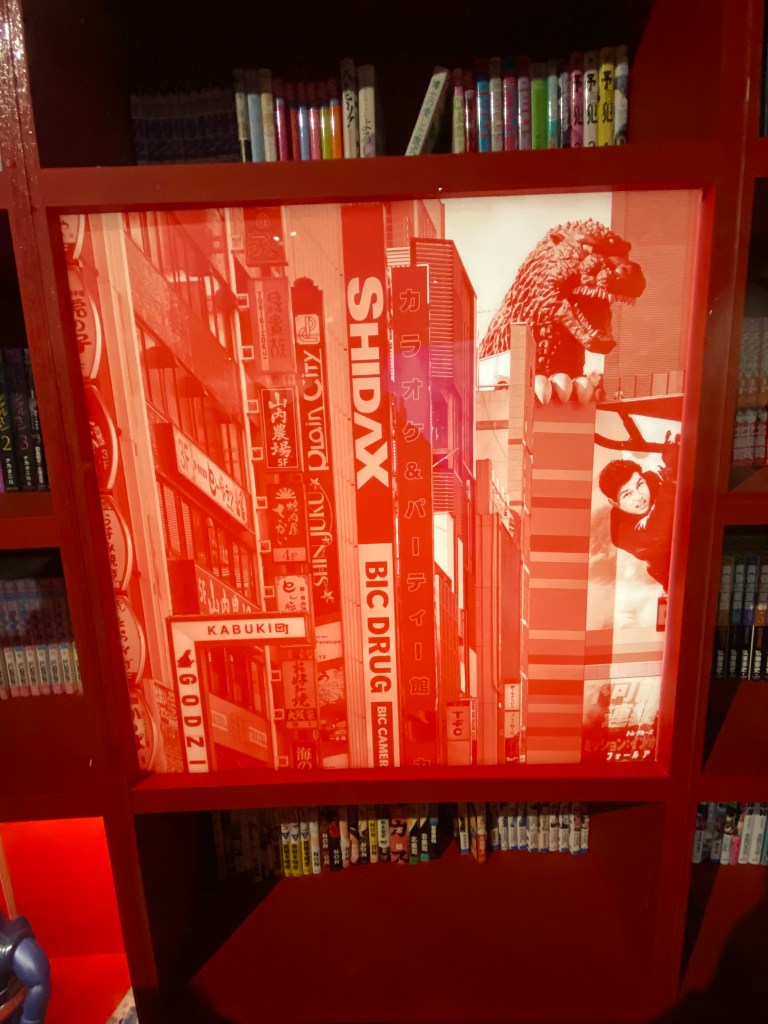 Dès l’entrée c’est ok : reproduction de mangas, dont un Gozilla et l’ambivalence du Japon entre identité de l’archipel et influence américaine/occidentale – un miroir aux alouettes.