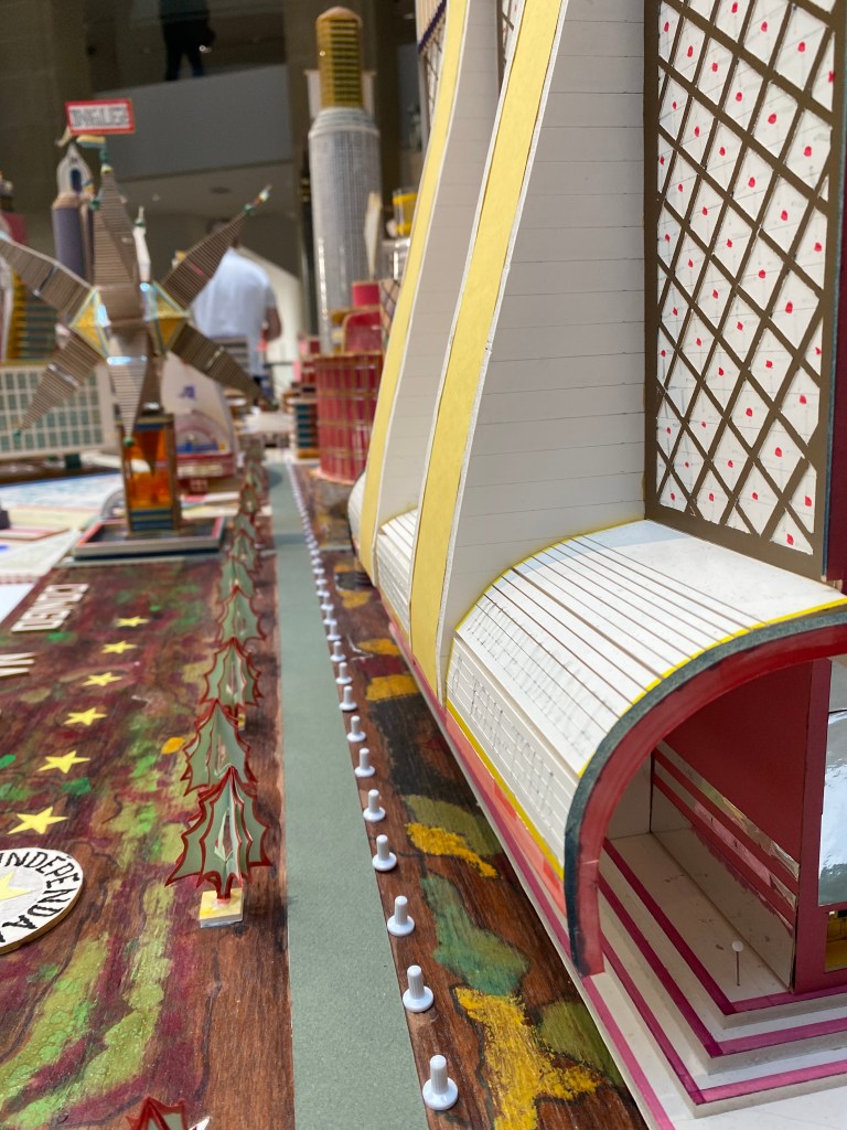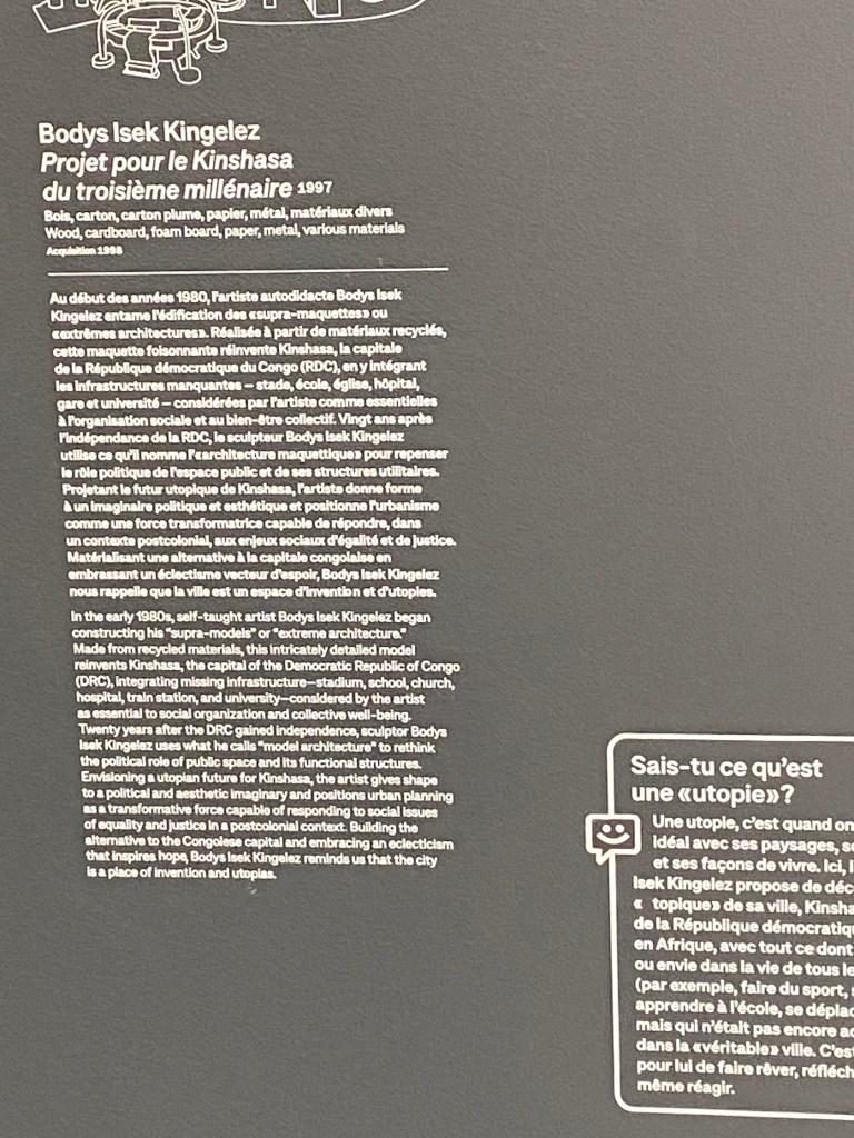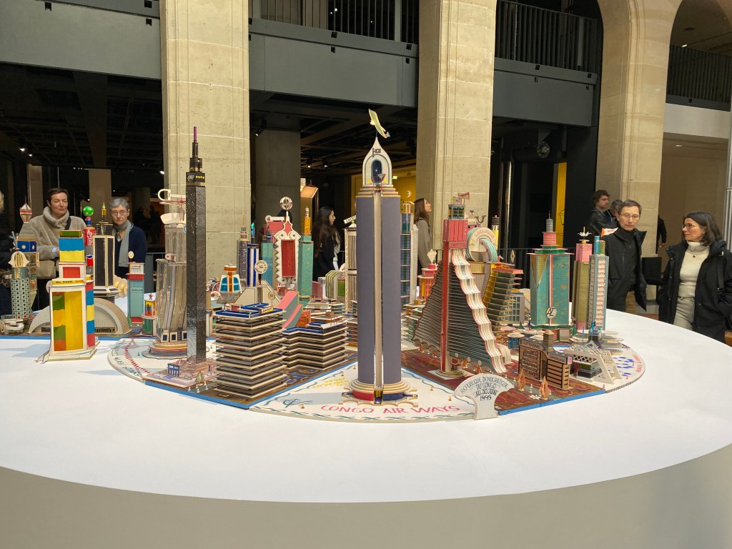 Dès le début ( nous ne sommes encore dans l’entrée de la fondation) il est très perceptible que les artistes viendront des 5 continents, comme cette Kinshasa du 3e millénaire (artiste : Bodys Isek Kingelez) construite grâce à des matériaux de récupération et qui ainsi est un exercice de rétro-futurisme achevé.